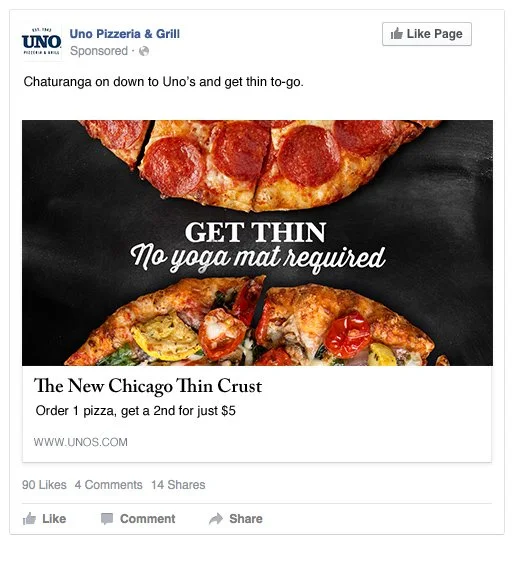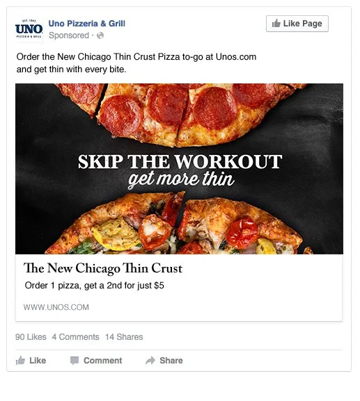 To support UNOs unveiling of their new Chicago Thin Crust pizza menu, UNOs launched their “Get Thin” Campaign. This campaign was a bit tongue-in-cheek for pizza-lovers. I created assets for social media and digital advertising.